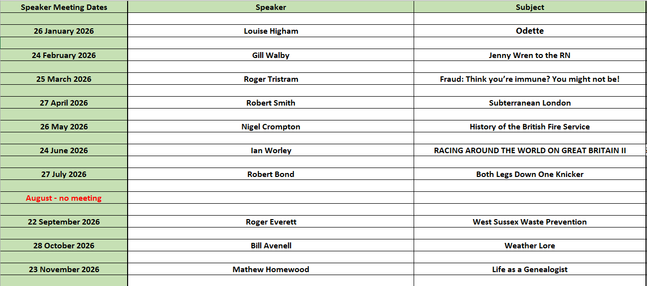 All meetings start at 2.00pm and are held at The Littlehampton United Church, 1 High Street, Littlehampton BN17 5EG. There is an entrance fee of £3 for members and guests which includes tea, coffee and biscuits. Please bring your own mug. Free two hour parking (with a parking disc) is available at the adjacent St.Martins car park.  We look forward to seeing you there.